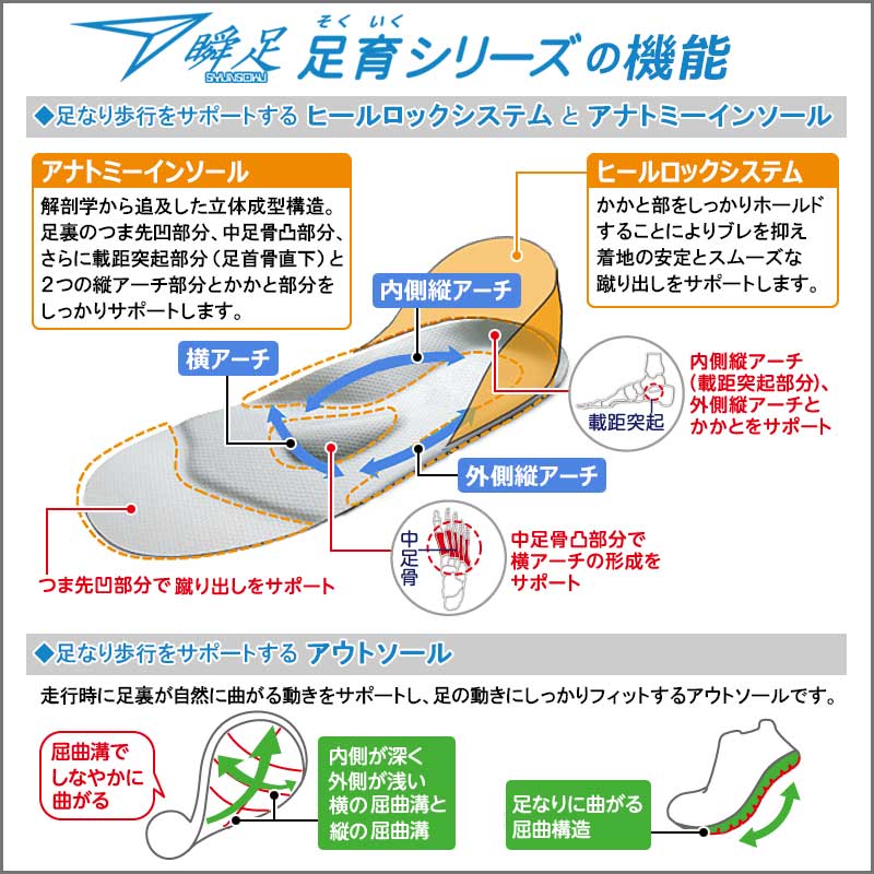瞬足そくいく=瞬足(アキレス)× 順天堂大学 2E(ふつう)設計 アキレスと順天堂大学の共同開発で生まれた「正しい歩行が自然と身につく靴」です! 子供たちの正しい足の育成をサポートするヒールロックシステムとアナトミーインソール、アウトソールを採用し、正しい歩行が自然に身につくように設計されています。