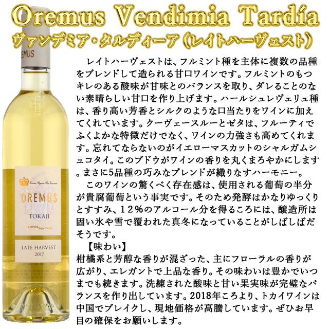 商品詳細 ■商品番号 175242 ■商品種別 デザートワイン ■内容量 500ml ■アルコール度数 - ■原産国 ハンガリー ■産地 トカイ ■メーカー オムレス ■原材料 フルミント、ハーシュレヴェルー、ゼータ、シャールガ ムシュコターイ クーヴェースルー コメント ベンディミア・タルディーア(レイトハーベスト)は、異なる品種を混ぜるクパージュにより醸造されます。